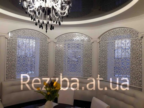 Декоративні накладки на вікна, різьблений візерунок прикрасив і приховав від зайвих очей у місце штор.