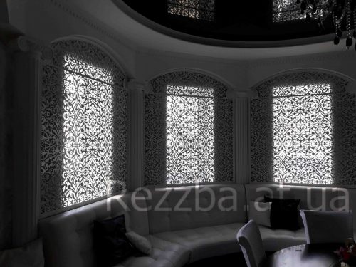 Декоративні накладки на вікна, різьблений візерунок прикрасив і приховав від зайвих очей у місце штор.